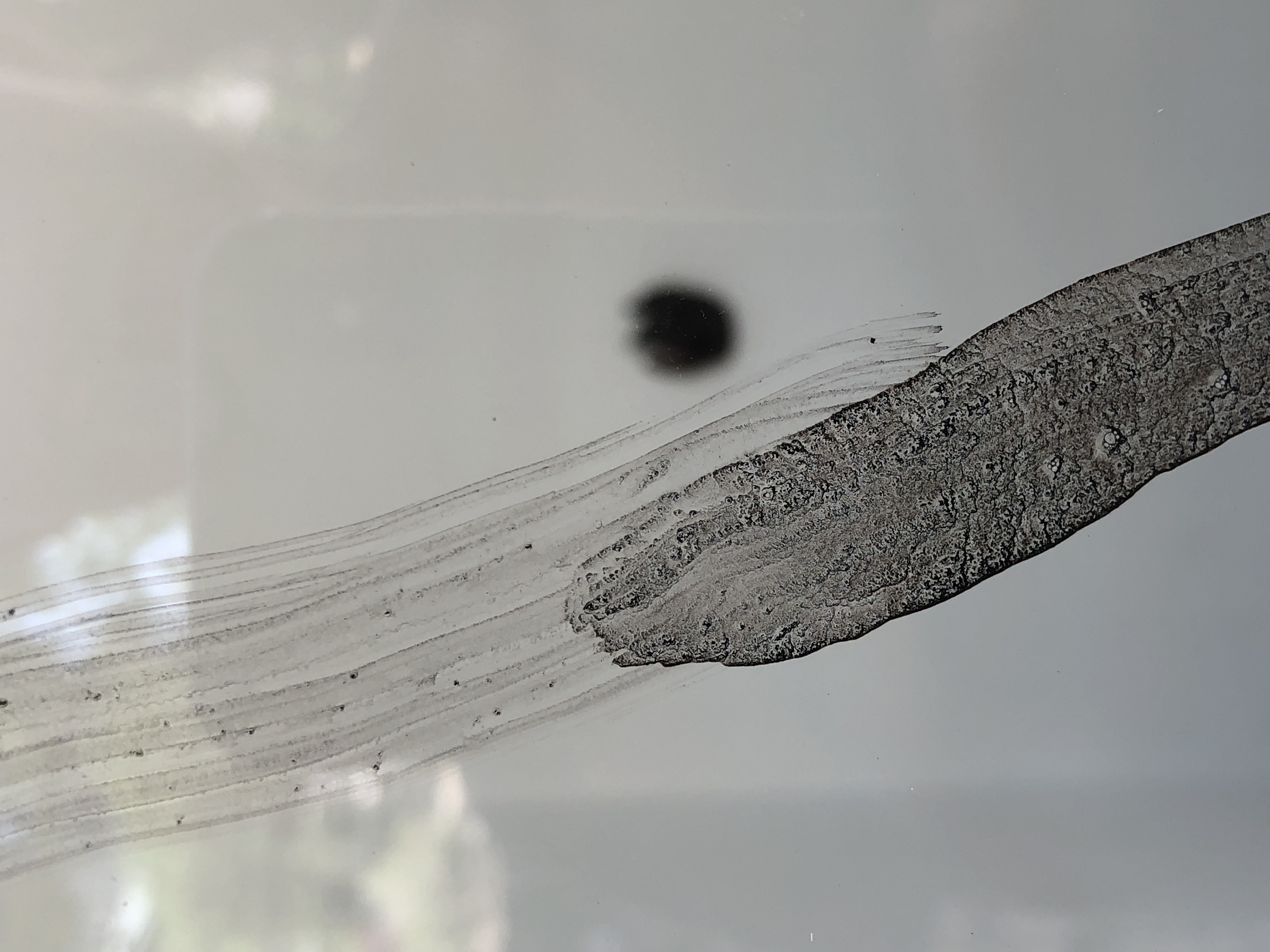 A solo exhibition at blind alley projects, Fort Worth TX, USA in 2022. The installation in this vitrine space included wall-mounted ceramic sculptures from the series Green, the short film Grove projected onto the ground (in line with the skylight) and the gigantic drawing Tar lines, painted with coal onto the inside of the window.